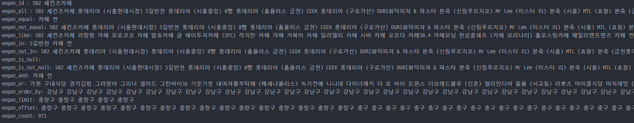 vegans = Vegan.query.filter(Vegan.shop != "카페 썬") vegan_not_equal = " ".join(i.shop for i in vegans) print(f"vegan_not_equal: {vegan_not_equal}")